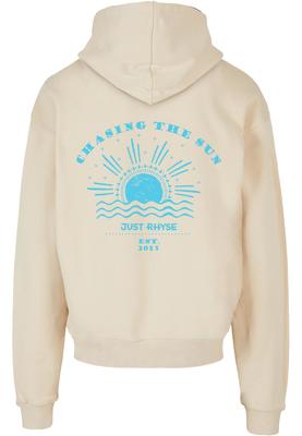 This hoodie features a large-scale graphic motif on the back, combining a sun and wave design with bold typography. The front is kept clean and minimalist, featuring a functional kangaroo pocket. The loose oversized fit with dropped shoulders ensures a modern silhouette and high wearing comfort. A double-layered hood and elasticated ribbed cuffs at the sleeves and hem highlight the premium craftsmanship and provide an ideal fit for everyday wear.