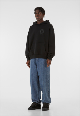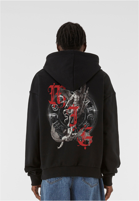 This oversized hoodie makes a bold fashion statement with its high-contrast graphics. While the front features a subtle circular logo on the chest, the back showcases a large-scale, detailed piece of artwork. The back motif combines a classical angel depiction with striking red Gothic-style lettering set against a mystical circular backdrop. The hoodie is equipped with a practical kangaroo pocket, a hood without drawstrings, and elasticated ribbed cuffs. The combination of heavy-weight fabric and dropped shoulders ensures a relaxed fit and premium comfort for everyday wear.