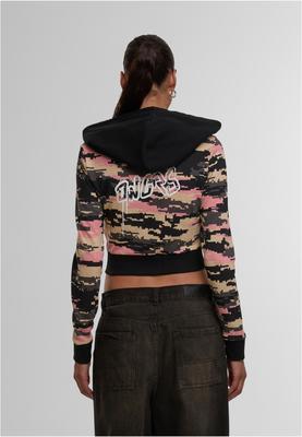 This cropped zip-up hoodie features an all-over digital camouflage print in pink and beige, accented by solid black details on the hood, hem, and cuffs. The design includes a full-length front zipper and an adjustable hood, complemented by a subtle chest embroidery and a bold graffiti graphic across the back for a distinct streetwear look.