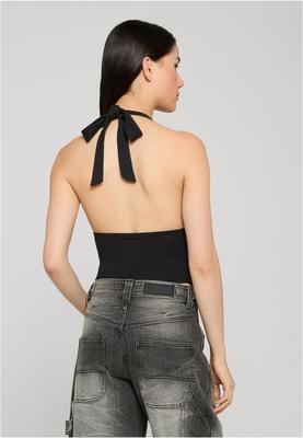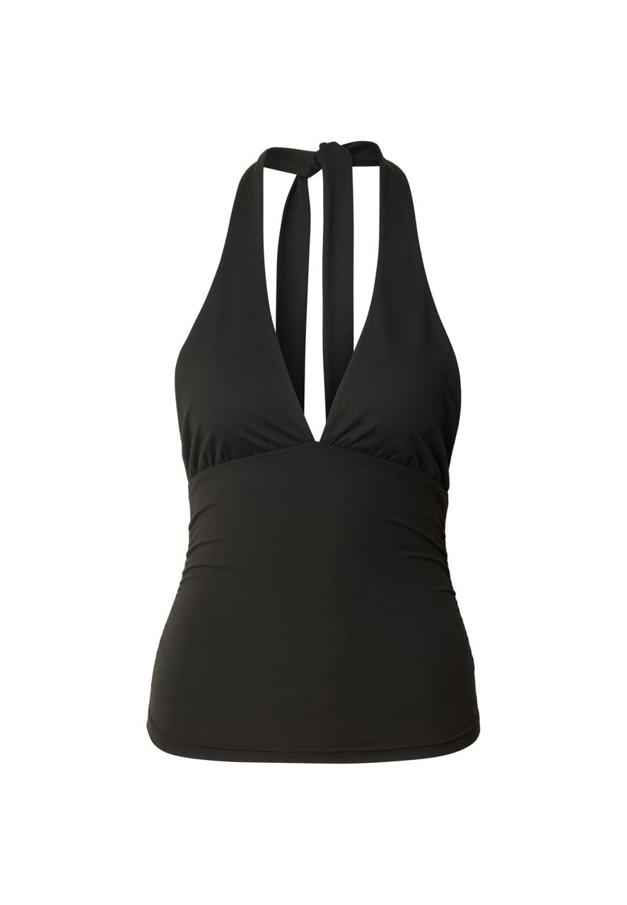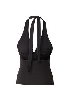 Halter top with a deep neckline and tie closure at the neck. The cut sits close to the body and is complemented by light ruching at the front. The polyamide jersey with stretch feels smooth and adapts to the shape. The open back and clean hem keep the design simple and reduced. A straightforward top with a focus on fit and material.