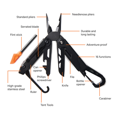 Built to Last, Made to Explore. The Nordic Drift Adventure Multi-function Pliers are premium, adventure-proof pliers designed for demanding outdoor use and everyday preparedness. Made from high-grade stainless steel, they deliver durable, long-lasting performance in a compact and reliable design. Featuring 16 integrated functions — needle-nose pliers, standard pliers, wire cutter, carabiner, bottle opener, file, knife, saw, tent tool, ruler, serrated blade, box cutter, crowbar, can opener, Phillips screwdriver, and an integrated flint stick for reliable emergency fire starting — this tool offers maximum versatility without compromise. All Nordic Drift products are intensely tested for quality. Because we strongly believe in the performance and durability of our gear, every item is backed by a 5-year warranty on manufacturing defects.